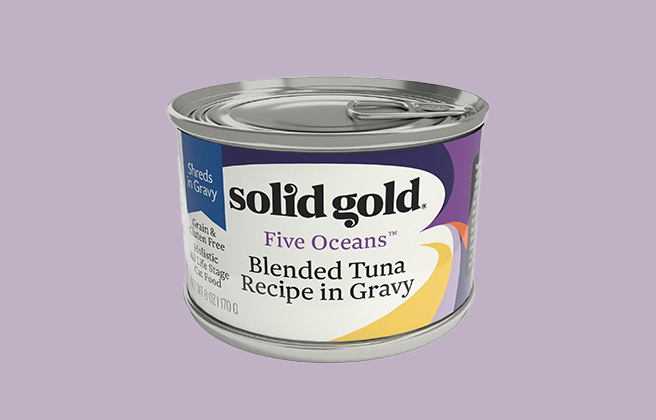 Solid Gold Five Oceans Shreds in Gravy with Blended Tuna in Gravy received the Cat Food Advisor’s second highest rating: 4.5 stars.